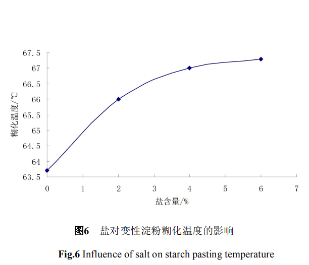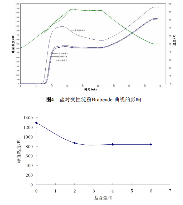 由圖4、圖5和圖6可以看出,鹽的存在對峰值粘度及糊化溫度的影響比較大, 首先是峰值已經(jīng)基本不存在,這是因為醋酸酯淀粉和丁二酸酯淀粉衍生物是屬于 陰離子型的高分子電解質(zhì),因此,鹽的存在會顯著影響溶液的粘度和糊化溫度。 峰值粘度從1291BU降到了836BU,糊化溫度從63.7℃上升到67℃。但由引入了交 聯(lián)基團,對鹽具有一定的抗鹽作用,所以冷粘度還是比較高。說明鹽對離子型的 醋酸酯淀粉具有破壞作用。而交聯(lián)具有一定的抑制作用。因此,在實際應(yīng)用中就 要制作出較低糊化溫度的變性淀粉,以避免在應(yīng)用過程中由于鹽的存在而使淀粉 不糊化的現(xiàn)象。