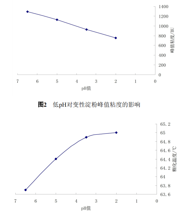 在變性淀粉的實際應(yīng)用過程中,介質(zhì)的pH值對其粘度、糊化溫度等指標的影 響較大,實驗測定了6%的木薯丁二酸雙酯交聯(lián)淀粉在不同酸性條件下的 Brabender曲線、峰值粘度以及糊化溫度的變化,結(jié)果如圖1、圖2、圖3所示???見在接近中性的環(huán)境中丁二酸雙酯化交聯(lián)粘度最高,酸性條件使得淀粉的粘度的 所下降,特別是在pH值3.5之下,下降的幅度最大。在pH值3.5以上表現(xiàn)比較穩(wěn)定, 說明在一定酸性條件下,丁二酸雙酯化交聯(lián)淀粉具有比較高的增稠穩(wěn)定性。