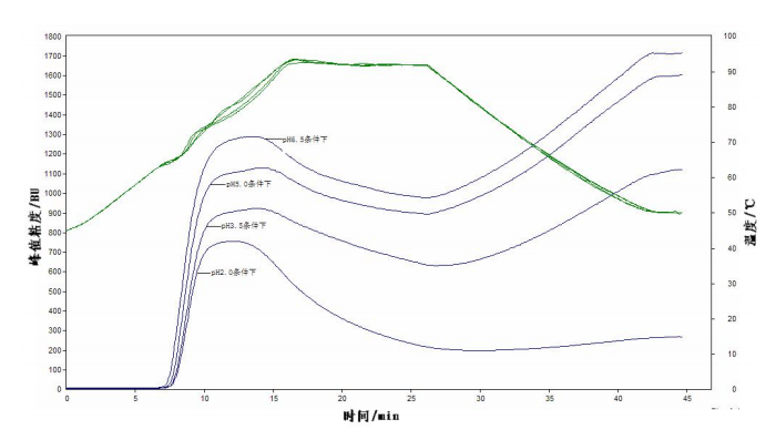 在食品中,很多情況下都是在酸性條件下應(yīng)用,因此,在酸性條件下考查淀 粉的粘度變化,了解變性淀粉在酸性條件下的穩(wěn)定性是有必要的。由圖1可以看 出,變性淀粉在酸性條件下粘度曲線發(fā)生很大變化,pH值越低,峰值降得越低,糊 化溫度升得越高,當(dāng)pH值為3.5時曲線開始發(fā)生嚴重變形,峰值和尾峰粘度大幅下降。