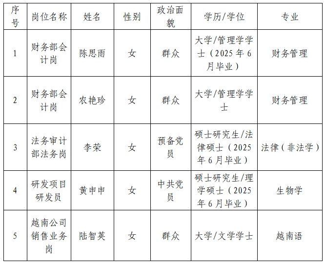 廣西農(nóng)墾明陽(yáng)淀粉發(fā)展有限公司2024年秋季公開(kāi)招聘擬錄用人員名單