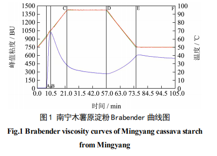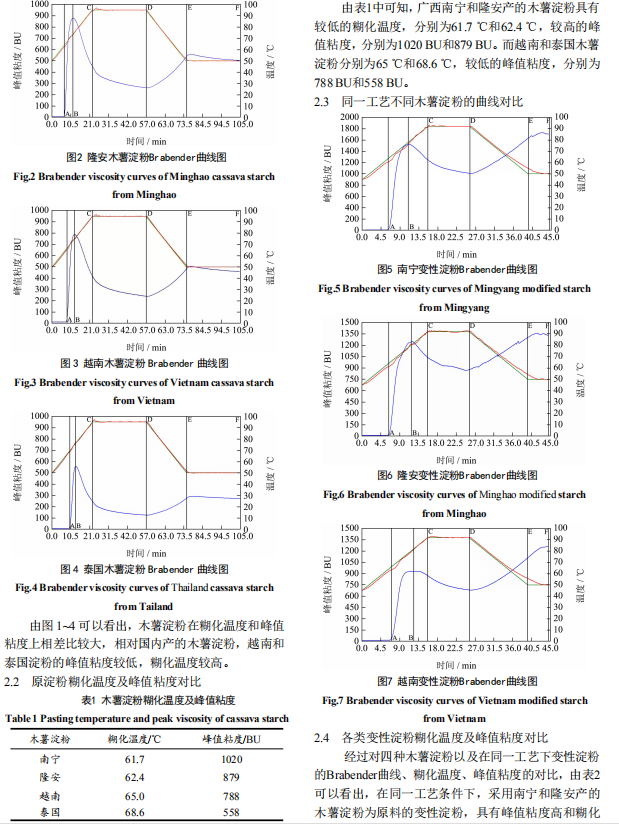 木薯原料性能的好壞是影響其變性淀粉的重要 因素,為了獲得更低糊化溫度和較的高峰值粘度的木 薯變性淀粉,在生產(chǎn)上,首先要對木薯淀粉原料的糊 化溫度、峰值粘度及熱粘度等指標進行分析,從而選 擇品質(zhì)較好的木薯原淀粉作為生產(chǎn)的原料。因此采用 Brabender 和 NDJ-79 型粘度儀對四種木薯淀粉的糊化 溫度和粘度進行研究,從而選擇具有低糊化溫度、高 峰值粘度及高熱粘度的木薯淀粉作為生產(chǎn)原料,生產(chǎn) 出具有優(yōu)良性能的乙酰化交聯(lián)變性淀粉,以下為四種 木薯淀粉的 Brabender 粘度曲線對比圖及分析。
